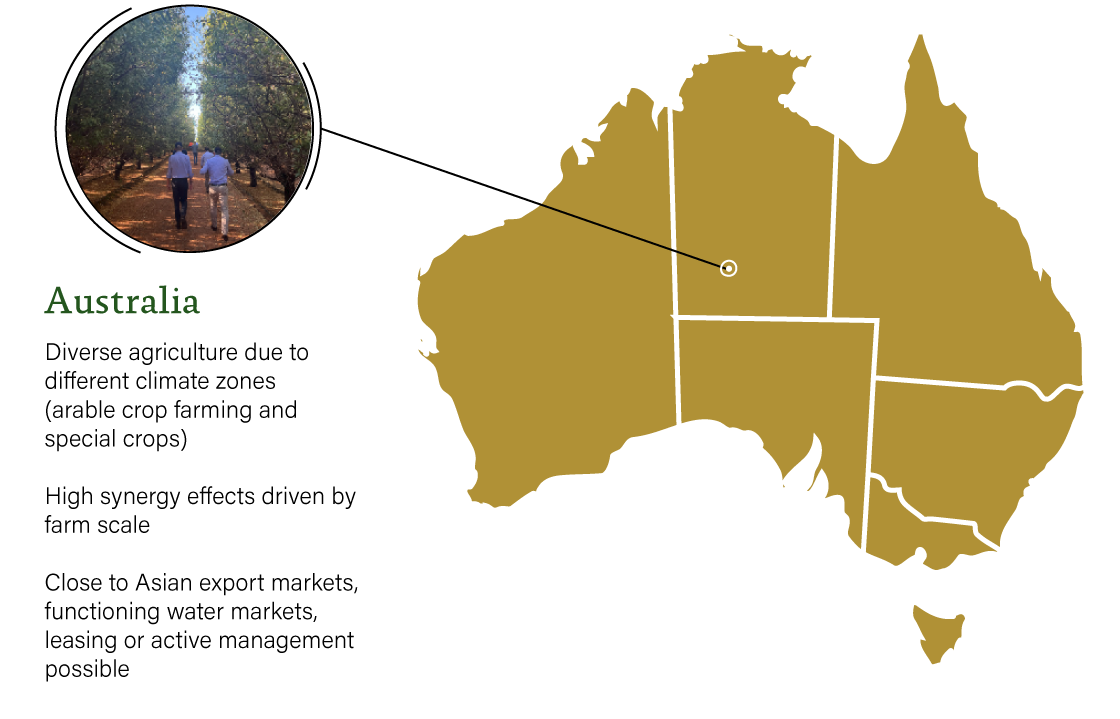 Australia has very different climatic conditions due to the size of the country. This leads to very diverse agriculture and includes the cultivation of traditional cash crops such as wheat through to specialty crops such as nut or fruit trees. This is always combined with a highly efficient use of water.