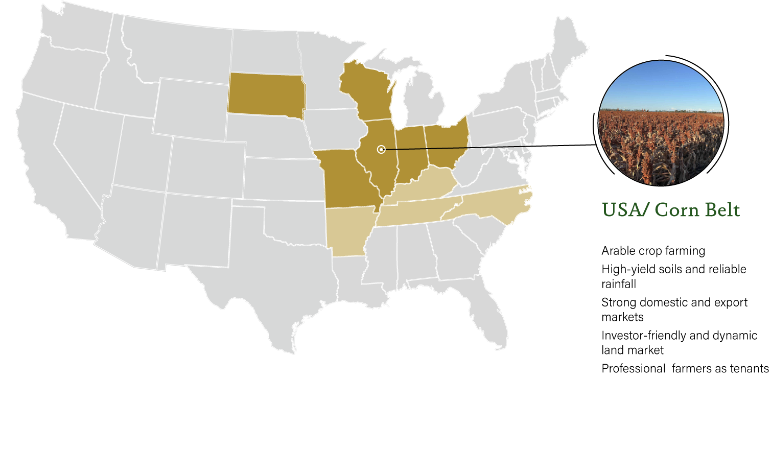 The United States has the world’s largest and most transparent land market. Here there are opportunities to build a diverse, high-quality land portfolio. Local farmers are actively seeking external capital, and we use this environment for targeted investments. Our strategy is to support acquisition and long-term management of agricultural enterprises, especially in regions from the Lake States to Arkansas, through local presence and partnerships with experienced farmers to whom the land is leased.