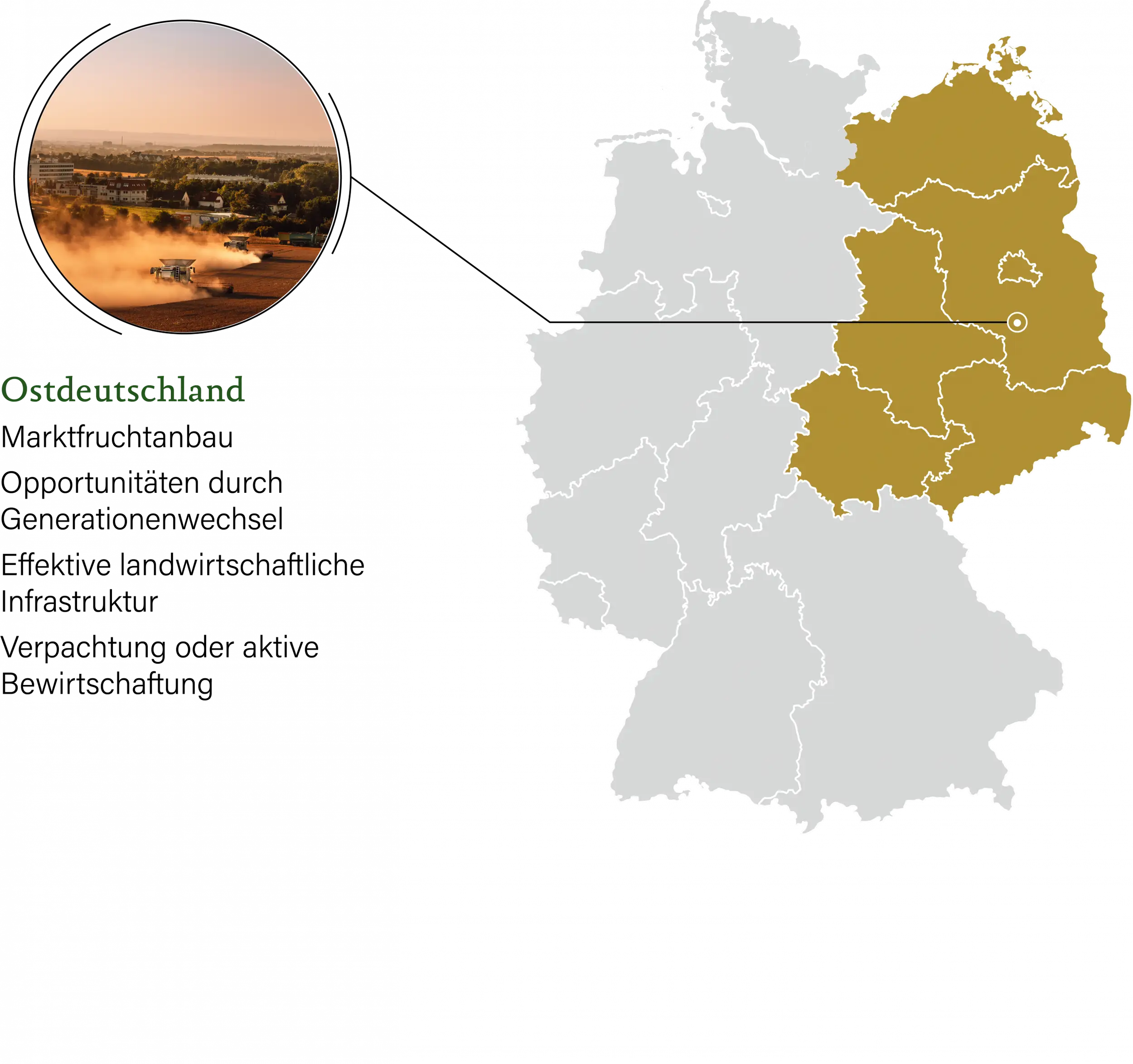 In den neuen Bundesländern eröffnet der Pensionsantritt der „Wendegeneration“ die Möglichkeit, großflächige, etablierte Agrarbetriebe zu erwerben. Unser Fokus liegt auf der Akquise und dem langfristigen Management dieser Betriebe. Wir übernehmen vor Ort die Geschäftsführung und die aktive Bewirtschaftung der Betriebe mit Schwerpunkt auf Marktfruchtanbau. Ziel ist der nachhaltige Aufbau leistungsfähiger Betriebseinheiten mit regionaler Verankerung und stabilem Cashflow.