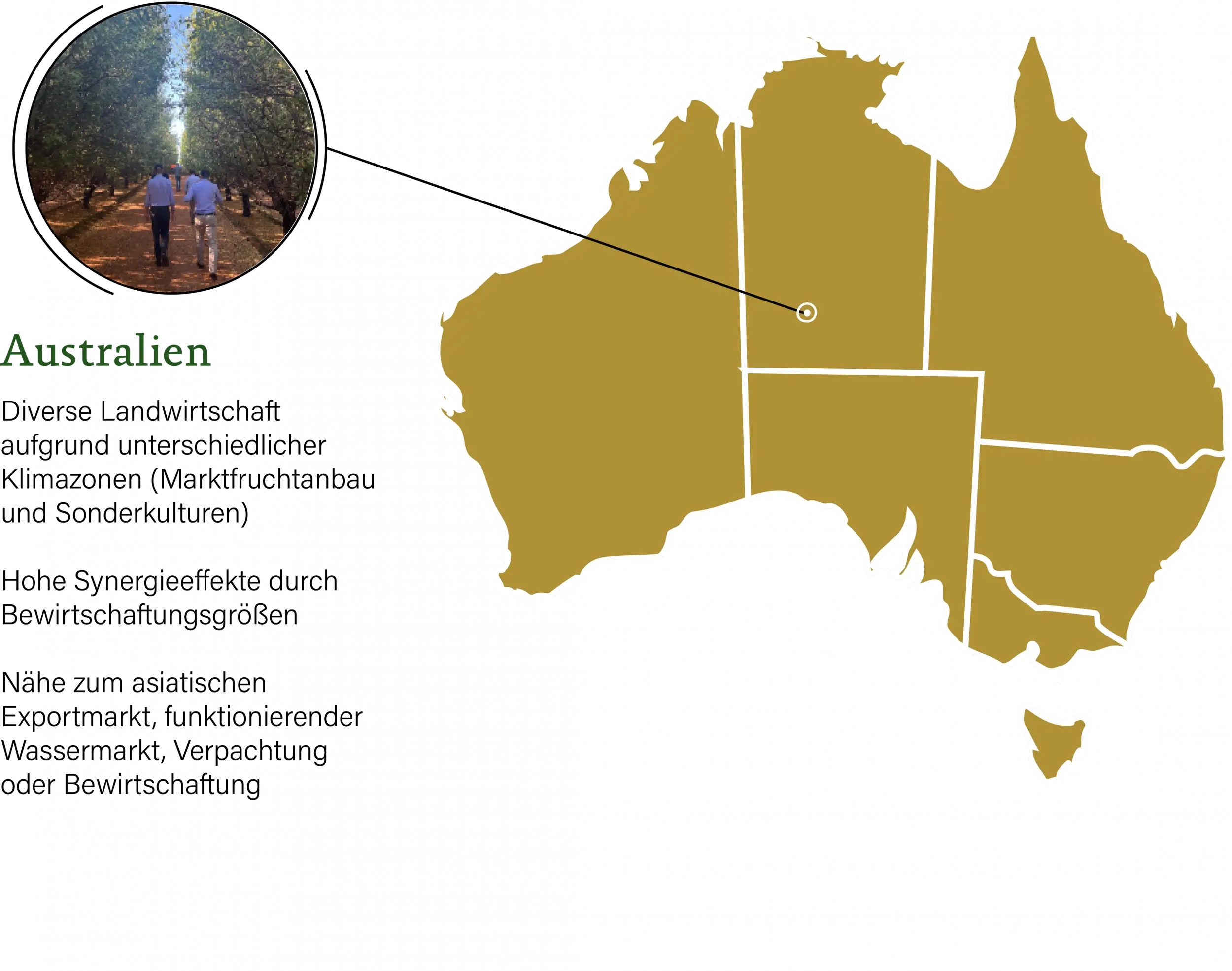 Australien verfügt aufgrund der Landgröße über stark unterschiedliche klimatische Bedingungen. Dies führt zu einer sehr vielfältigen Landwirtschaft und umfasst den Anbau von klassischen Marktfrüchten wie Weizen bis hin zu Sonderkulturen wie Nuss- oder Obstbäumen. Verknüpft ist dies immer mit einer hocheffizienten Nutzung von Wasser. Dieses Umfeld nutzen wir, um größere Portfolien zu diversifizieren und Sichtbarkeit in den Nachfragemärkten Ozeanien/Asien aufzubauen. Dazu kooperieren wir mit erfahrenen Landwirten, an die die Fläche verpachtet wird und begleiten diese im Management. In Australien kommen insbesondere die Küstenregionen in Western Australia, New South Wales, Queensland und Victoria in Frage.