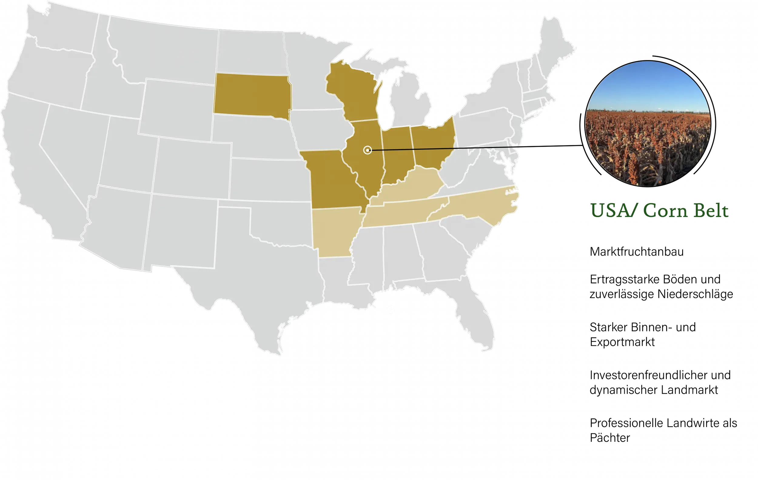 Die USA verfügen über den größten und transparentesten Bodenmarkt weltweit. Hier bietet sich die Chance, ein diversifiziertes, qualitativ hochwertiges Landportfolio aufzubauen. Lokale Landwirte suchen aktiv nach externem Kapital und wir nutzen dieses Umfeld für gezielte Investitionen. Unsere Strategie: Durch unsere lokale Präsenz vor Ort fördern wir den Erwerb und das langfristige Management von Ackerbaubetrieben zwischen den Lake States und Arkansas. Wir setzen auf wirtschaftlich starkes Management und enge Kooperationen mit erfahrenen Landwirten, an die wir die Flächen verpachten und aktiv begleiten.