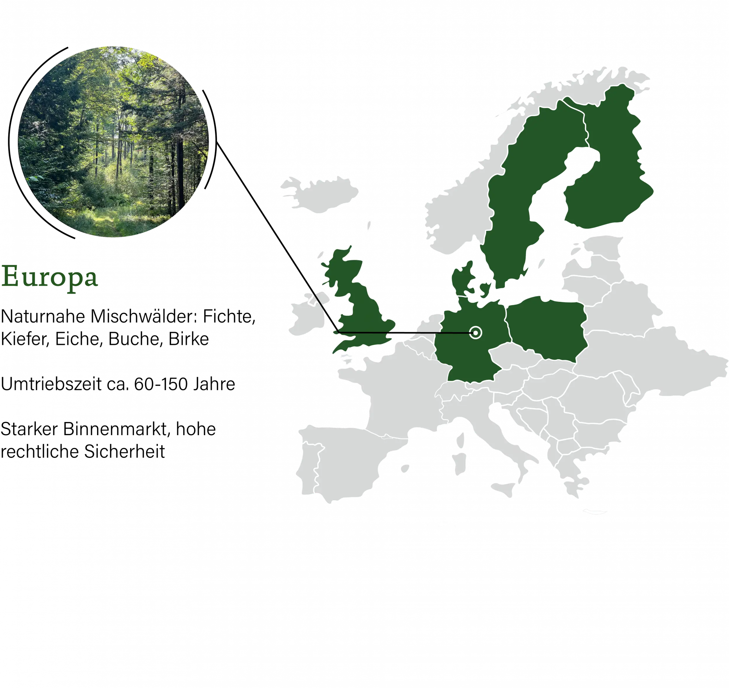 Europa – insbesondere Deutschland, Skandinavien und das Vereinigte Königreich – zählt zu den etabliertesten Standorten für nachhaltige Forstinvestitionen. Neben hoher Rechtssicherheit und stabilen Eigentumsverhältnissen überzeugen diese Märkte durch ihre professionellen Strukturen, gut entwickelte Infrastruktur und etablierte Zertifizierungssysteme. Die Region bietet sehr gute bis gute Wachstumsbedingungen, wobei Skandinavien aktuell zu den attraktivsten Zielmärkten für Waldinvestments zählt.