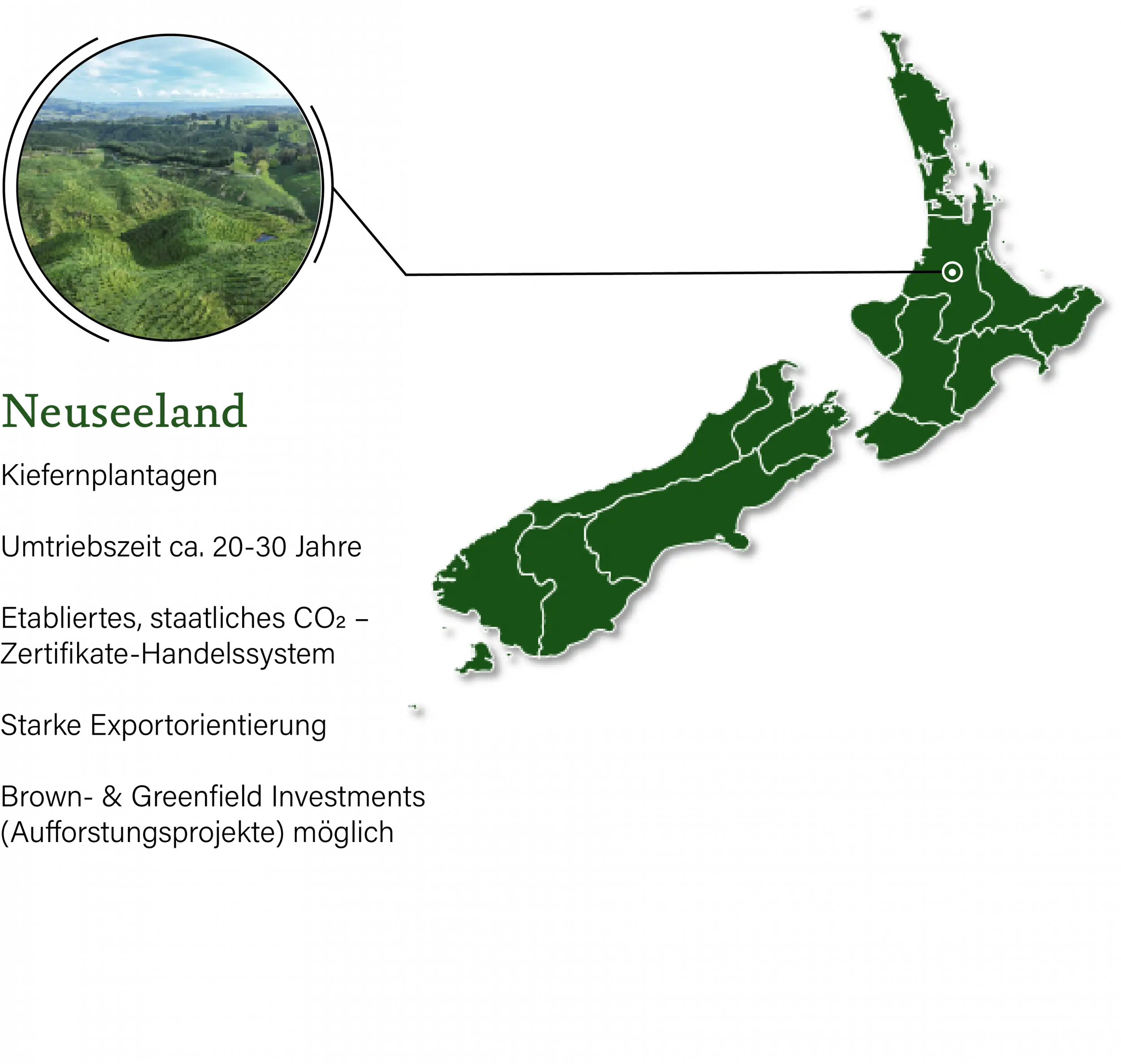 Neuseeland zählt zu den attraktivsten Standorten für nachhaltige Forstinvestitionen. Neben optimalen Wachstumsbedingungen und kurzen Umtriebszeiten überzeugt das Land vor allem durch sein etabliertes, staatlich reguliertes CO₂-Zertifikate-Handelssystem – ein wesentlicher Treiber für Wert und Ertrag. Gemeinsam mit unseren lokalen Partnern investieren wir sowohl in bestehende Forstbestände (Brownfield-Projekte) als auch in Aufforstungsprojekte (Greenfield-Investments). Unser nachhaltiges Management umfasst nicht nur die professionelle Bewirtschaftung der Wälder, sondern auch die aktive Generierung und das Management von CO₂-Zertifikaten – als zusätzlicher Renditebaustein für Ihr Investment.