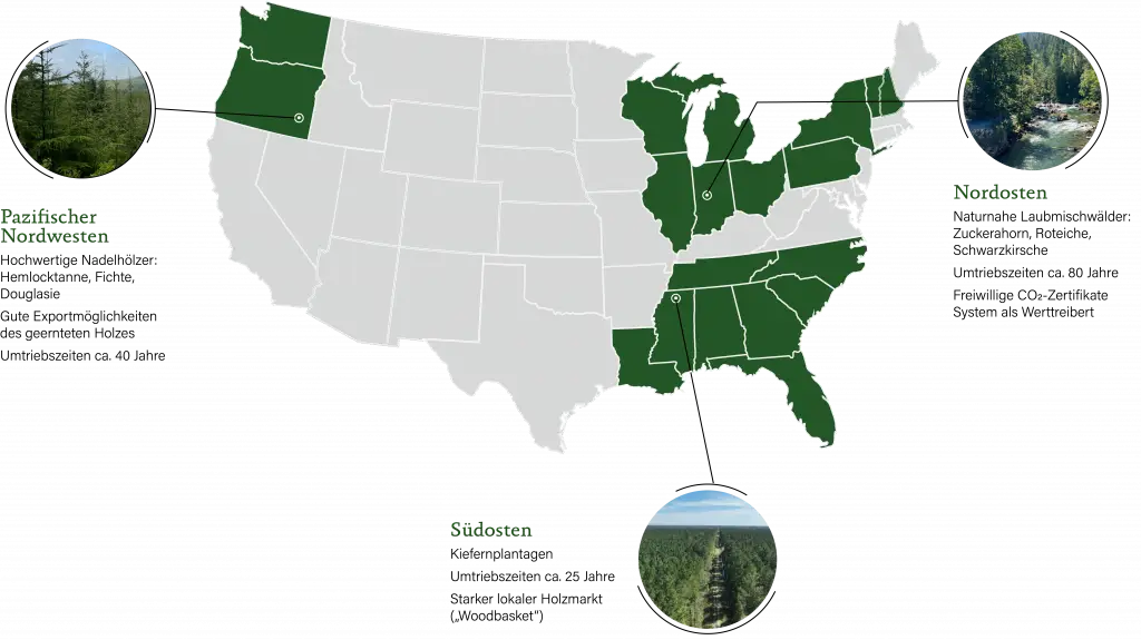 Die USA bieten einen der größten und etabliertesten Wald- und Holzmärkte weltweit – geprägt von hoher Liquidität, Transparenz und Rechtssicherheit. Der Zugang zu fungiblen Flächenmärkten, einem starken Binnenmarkt und einer hohen Holznachfrage machen die USA zu einem optimalen Investitionsstandort. Wir erwerben schwerpunktmäßig Wälder in den USA zur nachhaltigen und ertragsbringenden Holzproduktion, Wertschöpfung und CO₂-Zertifizierung. Unser professionelles Inhouse-Management durch unser lokal ansässiges Team gewährleistet eine nachhaltige Bewirtschaftung und engmaschige Zusammenarbeit mit erfahrenen lokalen Dienstleistern.